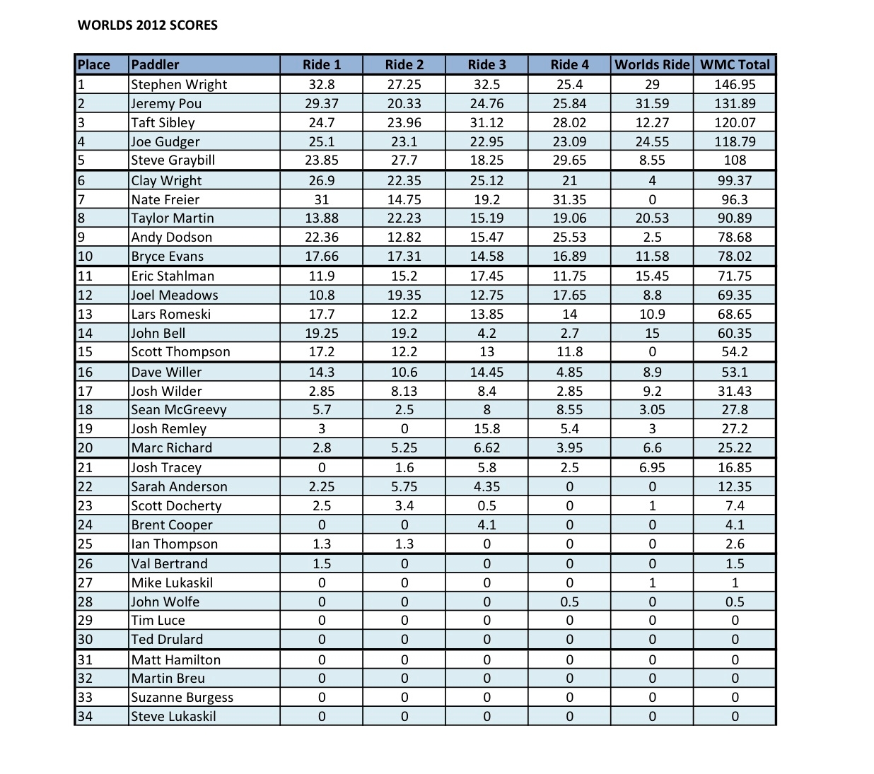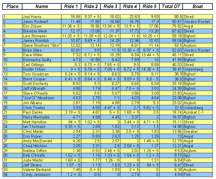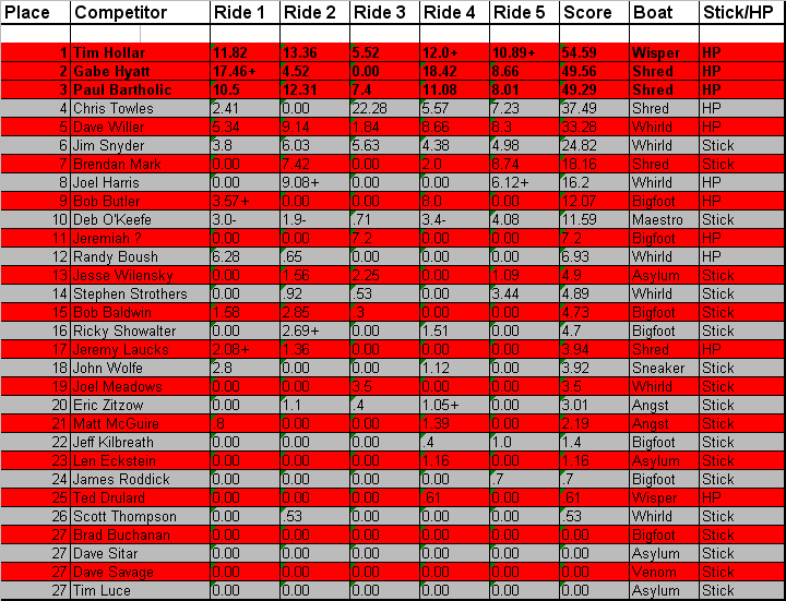 | Place | Paddler | Ride 1 | Ride 2 | Ride 3 | Ride 4 | Ride 5 | Total | Boat | Stick/HP |